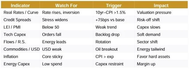 We remain constructive on innovation-led growth and believe the premium for durable cash-flow compounding remains intact. Yet, as the cycle matures, we will proceed with care—keeping core exposure to proven leaders while preparing to tilt toward cyclicals and energy when the data justify it. Our discipline favors signals over opinions, and flexibility over rigidity. Across a full market cycle, this approach is designed to protect capital and capture opportunity without false precision in timing.